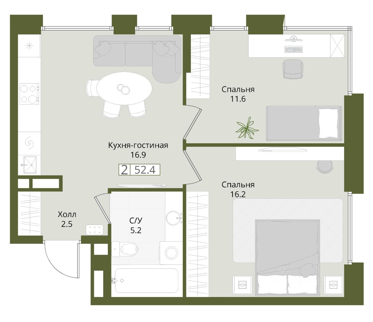 Продается 2-комнатная квартира на 4 этаже с готовой отделкой от застройщика. В квартире 2 спальни, кухня-гостиная, 1 санузел, вид на парковку/поликлинику. Угловая планировка. Общая площадь 52,4 кв.м.
