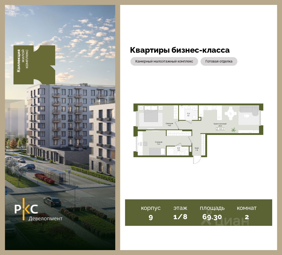 Агентам не звонить. Продается 2-комнатная квартира на 1 этаже с готовой отделкой от застройщика. В квартире будет мастер-спальня, 1 комната, 1 гардеробная, 2 санузла, вид на двор/парковку. Общая площадь 69,3 кв.м. На выбор представлены 3 вида дизайнерской отделки с использованием качественных материалов. Высота потолков 3 м. Площадь кухни 24.3 м2.