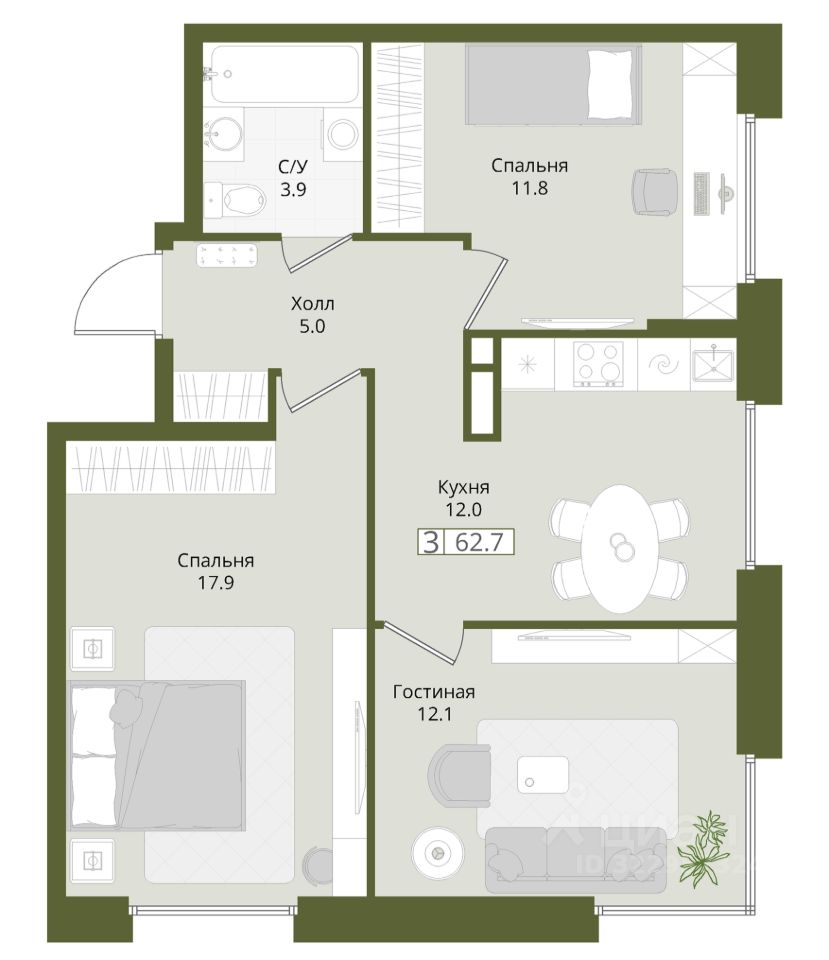 Продается просторная 3-комнатная квартира на 3 этаже с готовой отделкой от застройщика. В квартире 3 спальни ,1 санузел ,вид на дом/парковку/. Угловая планировка. Общая площадь 62,7 кв.м.