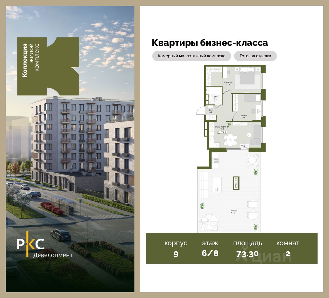 Продается 2-комнатная квартира на 6 этаже с готовой отделкой от застройщика. В квартире 2 спальни, кухня-гостиная, 1 санузел, гардеробная, терраса, вид на парковку. Общая площадь 73,3 кв.м.