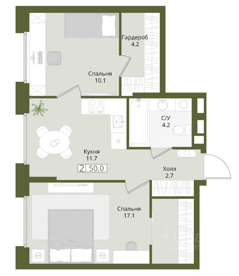 Продается уютная 2-комнатная квартира на 1 этаже с готовой отделкой от застройщика. В квартире 2 спальни, 2 гардеробные, 1 санузел, вид на парковку. Линейная планировка. Общая площадь 50 кв.м.