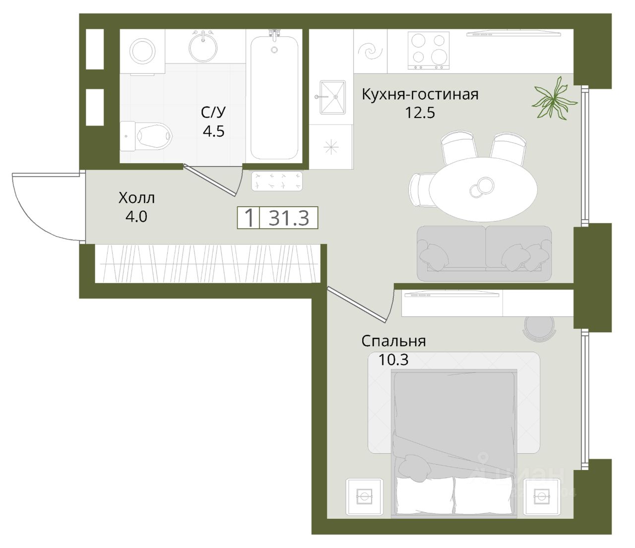 Продается 1-комнатная квартира на 4 этаже от застройщика. В квартире 1 спальня и кухня-гостинная, 1 санузел. Вид из окна на лес. Линейная планировка. Общая площадь 31,3 кв.м.