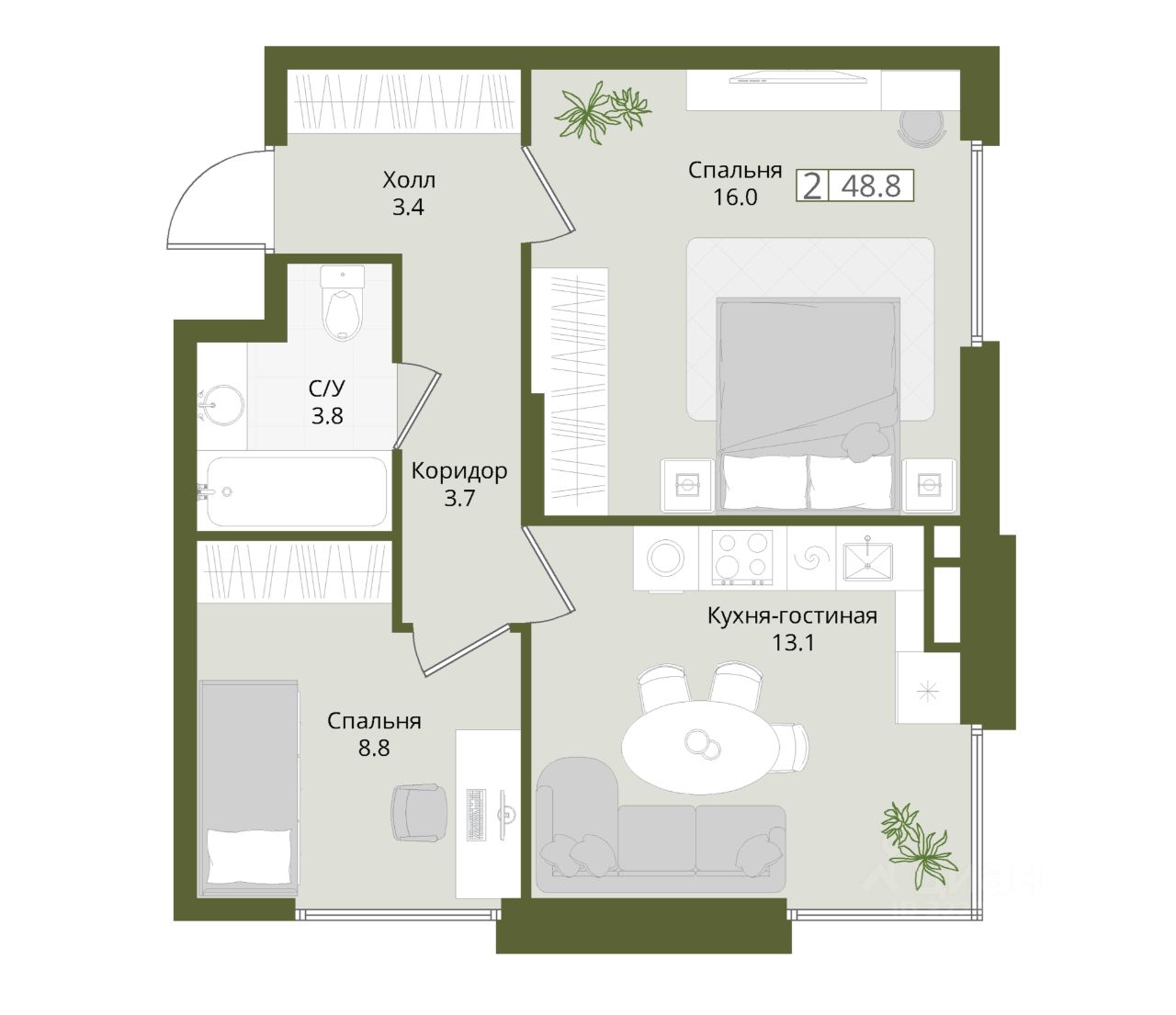 На выбор представлены 3 вида дизайнерской отделки с использованием качественных материалов. Высота потолков 3 м. Большая просторная кухня 13,1 м2.