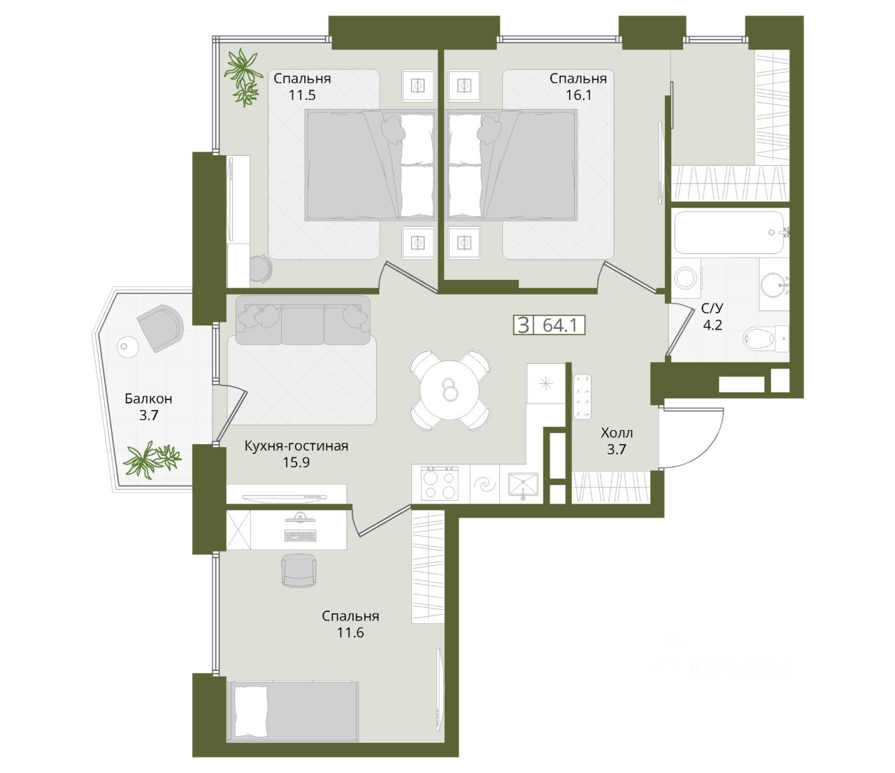 Продается просторная 3-комнатная квартира на 4 этаже с готовой отделкой от застройщика. В квартире 3 спальни ,1 санузел, балкон, вид на дорогу/парковку/парк. Угловая планировка. Общая площадь 64,1 кв.м.