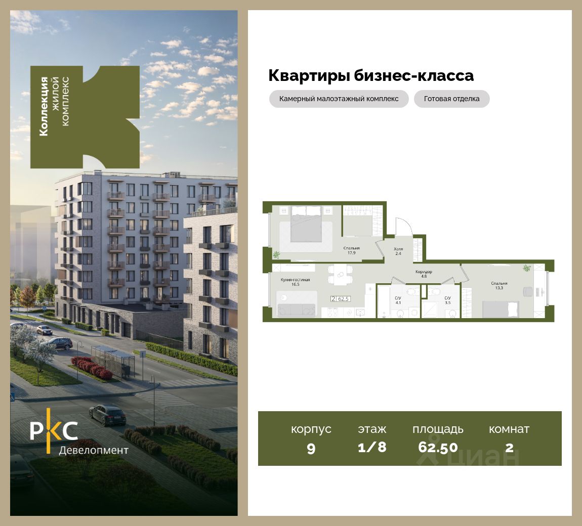 Продается 2-комнатная квартира на 1 этаже с готовой отделкой от застройщика. В квартире 2 спальни, 2 санузла, вид на парковку и двор. Общая площадь 62,5 кв.м.