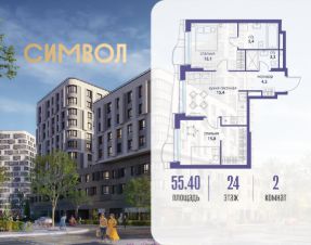 Продается 2-комнатная квартира от застройщика: общая площадь 55.40 м², жилая 27.10 м², кухня 15.40 м², 24-й этаж, жилой квартал "Вдохновение", корпус 35 (секция 1). Срок сдачи: 4 квартал 2027 года.