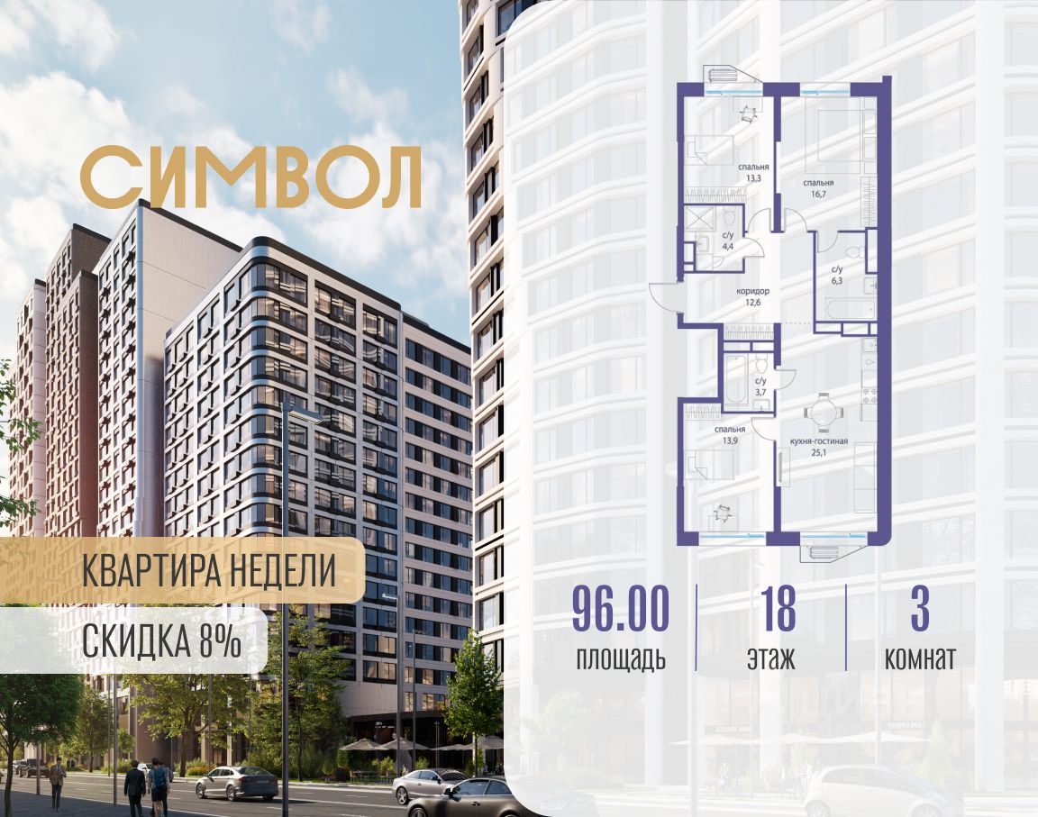 Продается 3-комнатная квартира от застройщика: общая площадь 96.00 м², жилая 43.90 м², кухня 25.10 м², 18-й этаж, жилой квартал "Гордость", корпус 36 (секция 3). Срок сдачи: 2 квартал 2029 года.