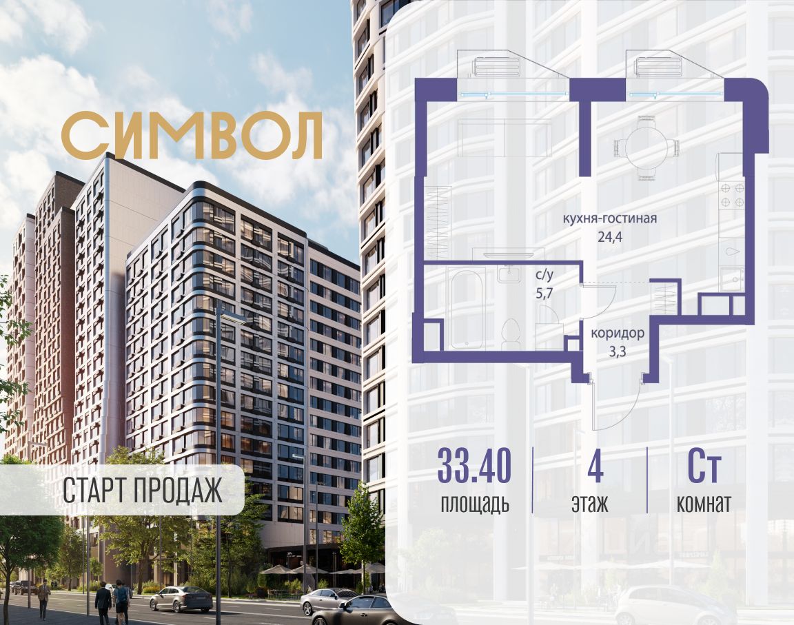 Продается квартира-студия от застройщика: общая площадь 33.40 м², жилая 10.00 м², кухня 14.40 м², 4-й этаж, жилой квартал "Гордость", корпус 36 (секция 4).  Срок сдачи: 2 квартал 2029 года.