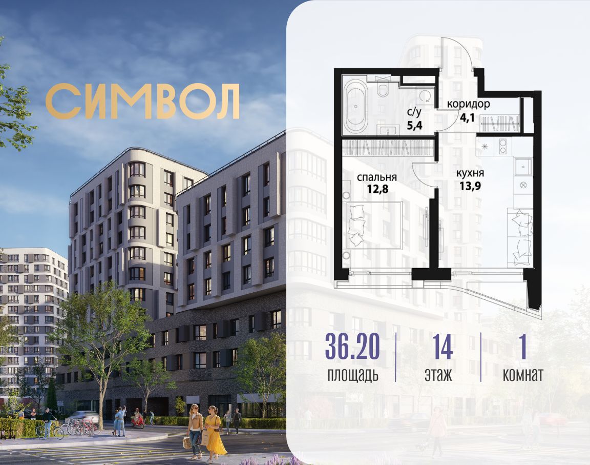 Продается 1-комнатная квартира от застройщика: общая площадь 36.20 м², жилая 12.80 м², кухня 13.90 м², 14-й этаж, жилой квартал "Вдохновение", корпус 33 (секция 1). Срок сдачи: 4 квартал 2027 года.