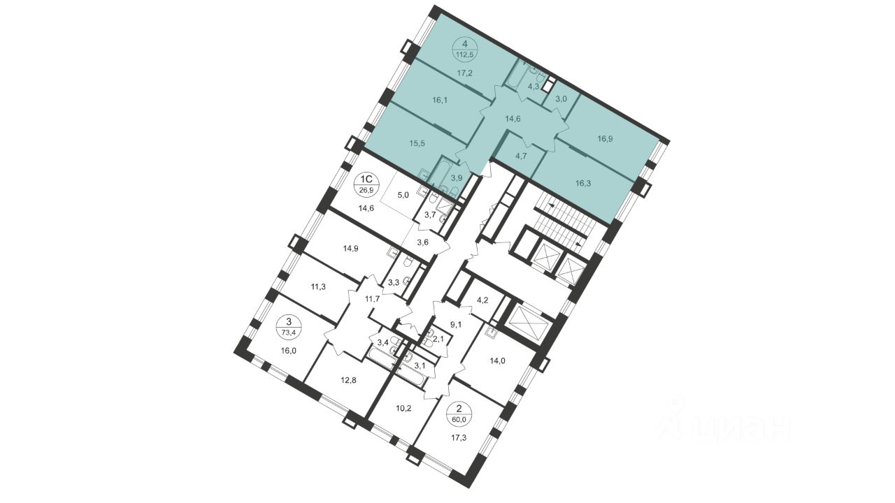 Общая площадь квартиры - 112,5 кв. м, этаж - 5 из 20.