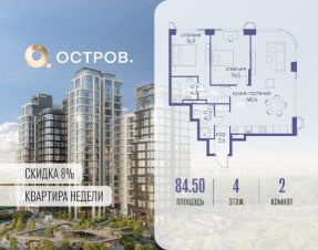 Продаётся 2-комн. квартира от застройщика: общая площадь 84.50 м², жилая 31.40 м², кухня 40.40 м², 4-й этаж, жилой квартал "Остров 12", корпус 1 (секция 1). Срок сдачи: 1 квартал 2029 года.