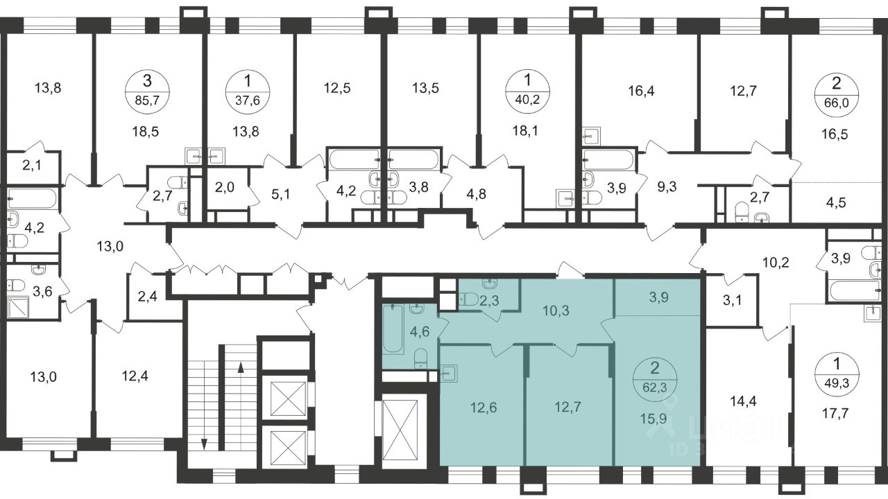 Общая площадь квартиры - 62,3 кв. м, этаж - 9 из 20.