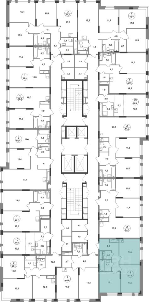 Общая площадь квартиры - 51,5 кв. м, этаж 16 из 19.