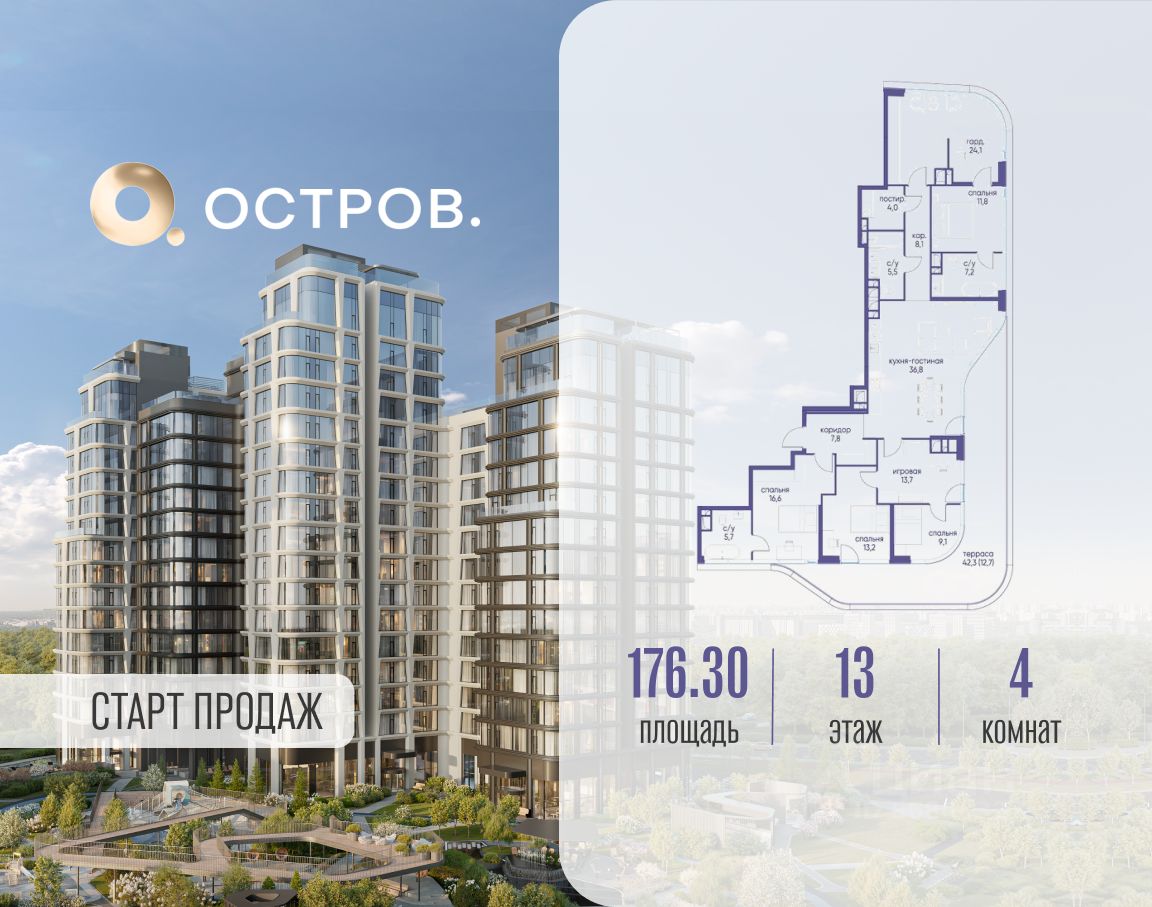 Продаётся 4-комн. квартира от застройщика: общая площадь 176.30 м², жилая 55.30 м², кухня 36.80 м², 13-й этаж, жилой квартал "Остров 12", корпус 6 (секция 1). Срок сдачи: 1 квартал 2029 года.