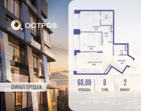 Продаётся двухкомнатная квартира от застройщика: общая площадь 68.00 м², жилая 24.90 м², кухня 23.30 м², 8, жилой квартал "Остров 12", корпус 1 (12.1 квартал) (секция 1). срок сдачи: 4-кв. 2025.