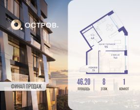 Продаётся однокомнатная квартира от застройщика: общая площадь 46.20 м², жилая 14.40 м², кухня 19.50 м², 8, жилой квартал "Остров 12", корпус 1 (12.1 квартал) (секция 1). срок сдачи: 4-кв. 2025.