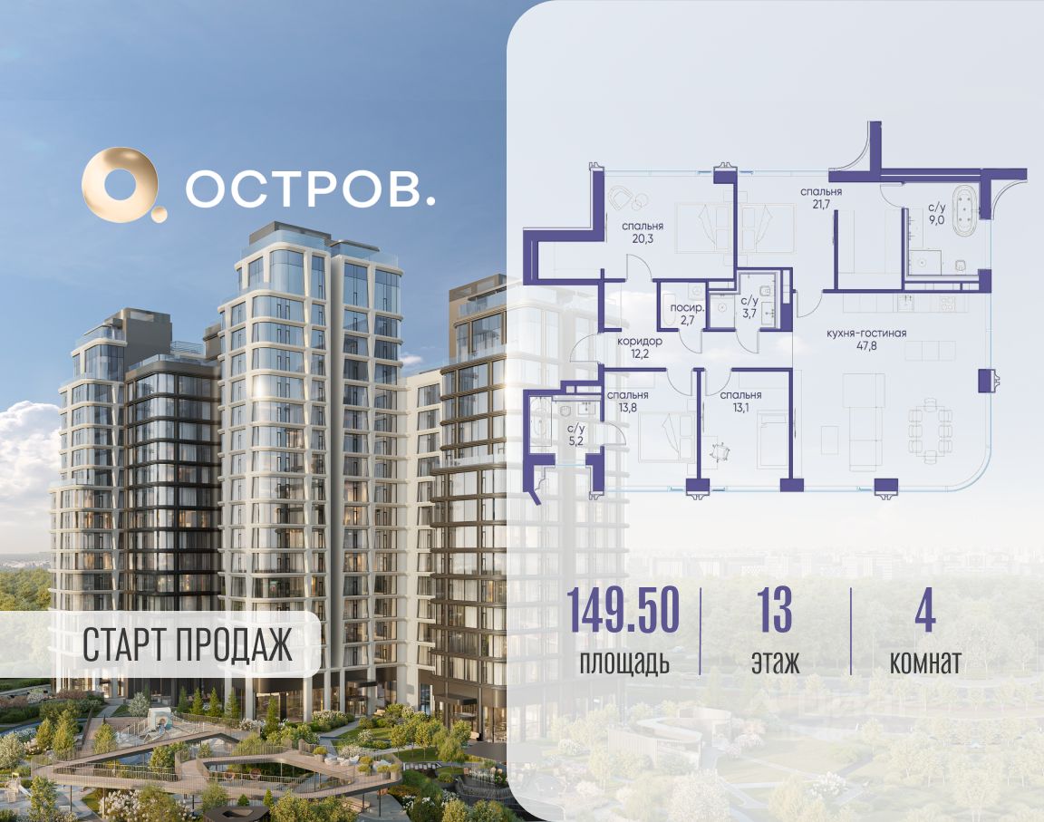 Продаётся 4-комн. квартира от застройщика: общая площадь 149.50 м², жилая 68.90 м², кухня 47.80 м², 13-й этаж, жилой квартал "Остров 12", корпус 2 (секция 1). Срок сдачи: 1 квартал 2029 года.