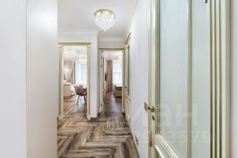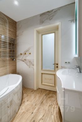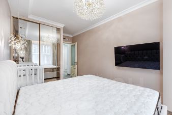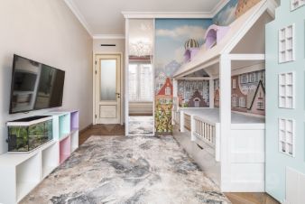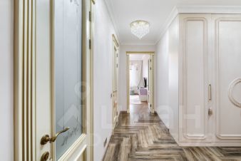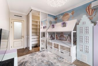 Отделка выполнена из премиальных материалов: инженерная доска Coswick, английские обои, краска Mylands, двери арт-деко с итальянской фурнитурой Cavali и Linea Cali. Встроенные гардеробные и кухня на заказ, фасады из шпона. Квартира оснащена современными системами: приточная вентиляция Breezart в каждой комнате, кондиционеры Haier, радиаторы Axxinot, скрытые потолочные системы освещения и система Neptune для защиты от протечек. Спальня и детская - шумоизолированы.