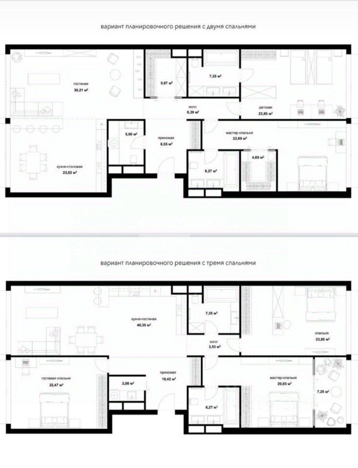 Возможность организации 2-х или 3-х спален плюс просторной кухни-гостиной благодаря удобной симметричной планировке и трем мокрым зонам.