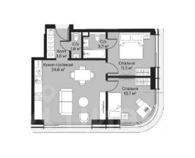 Планировкой предусмотрены 2 комнаты, просторная кухня-гостиная (24.6 кв.м.), 2 санузла, гардеробная.