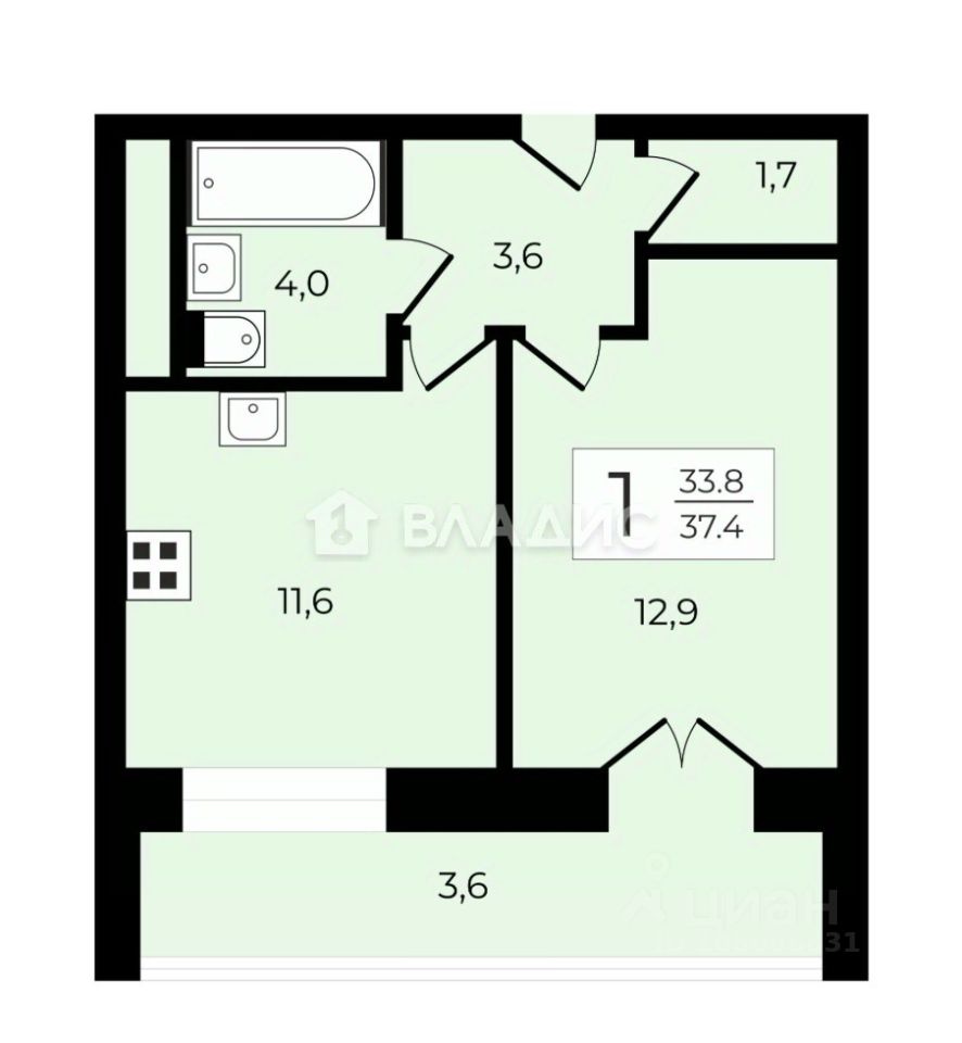 Общая площадь квартиры составляет 33.8 кв. м, из которых 25 кв. м — жилая площадь. Кухня занимает 7 кв. м, что идеально для уютных вечеров. Квартира находится на 5 этаже 21-этажного дома, построенного в 2020 году. Высокие потолки (3.1 метра) добавляют простора и света.