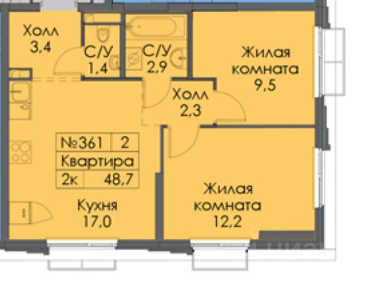 Общая площадь квартиры 48,2м2 - 2 изолированные комнаты 12,2м2 и 9,5м2, кухня-гостиная 17м2, 2 сан. узла. В холлах предусмотрены ниши для систем хранения. Квартира угловая с 4-мя окнами, будет много света и приятная атмосфера/проветриваемость. Квартира с чистовой отделкой/косметическим ремонтом от застройщика, остается только завести мебель. Прописка Москва.
