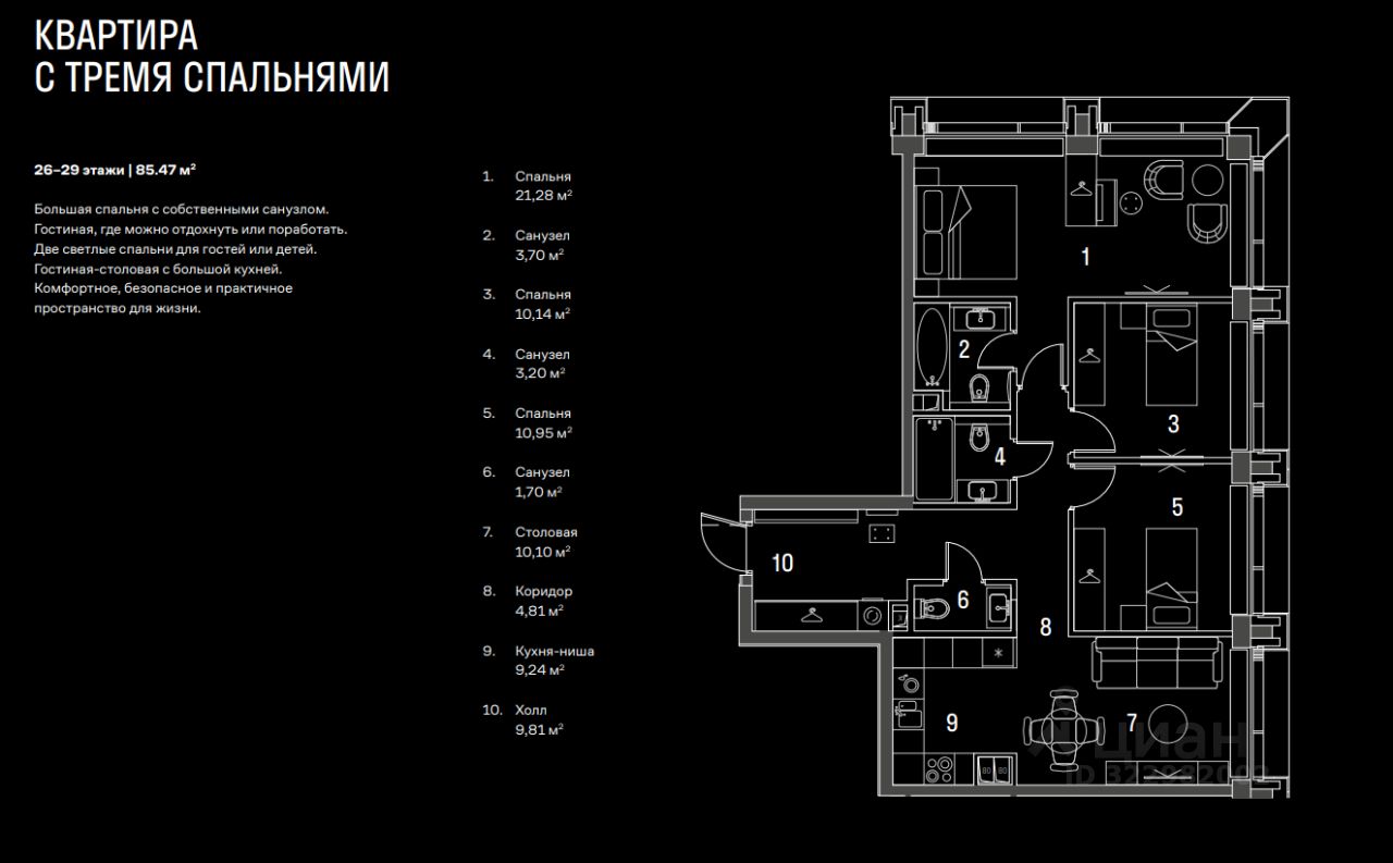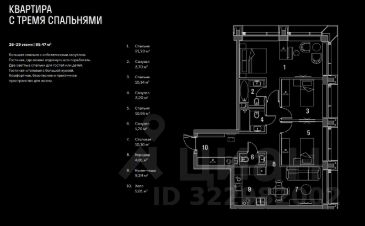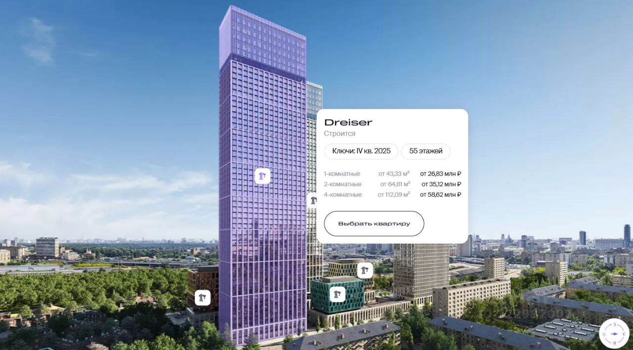 Видовая (4 окна в сторону центра) трехкомнатная квартира с просторной кухней-гостинной, общей площадью 85.39 кв. м, с предчистовой отделкой в ЖК премиум-класса Mod, на 24-м этаже 55 этажного дома в корпусе Д (Драйзер).