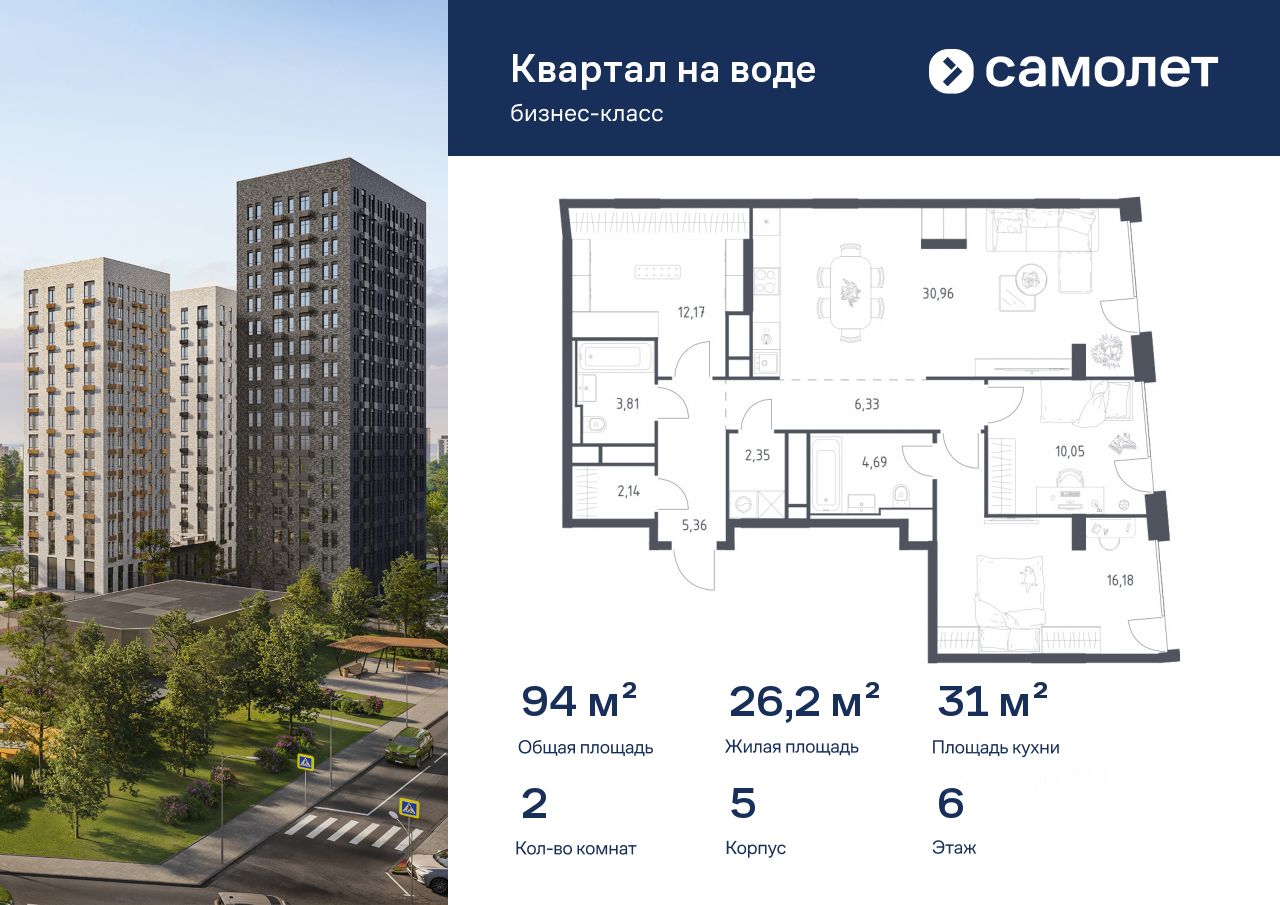 Строим кварталы для жизни с заботой о будущем. Предлагается 2-комнатная квартира бизнес-класса 94,04 кв.м в корпусе 5 на 6 этаже, в ЖК "Квартал на воде"