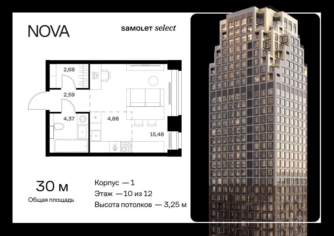 Строим кварталы для жизни с заботой о будущем. Предлагается квартира студия премиум-класса 30 кв.м в корпусе 1 на 10 этаже, в ЖК "NOVA"