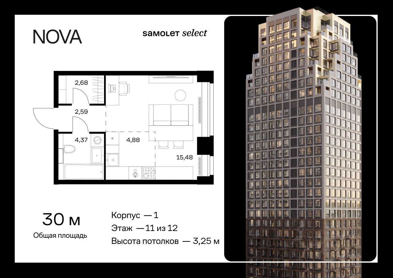 Строим кварталы для жизни с заботой о будущем. Предлагается квартира студия премиум-класса 30 кв.м в корпусе 1 на 11 этаже, в ЖК "NOVA"