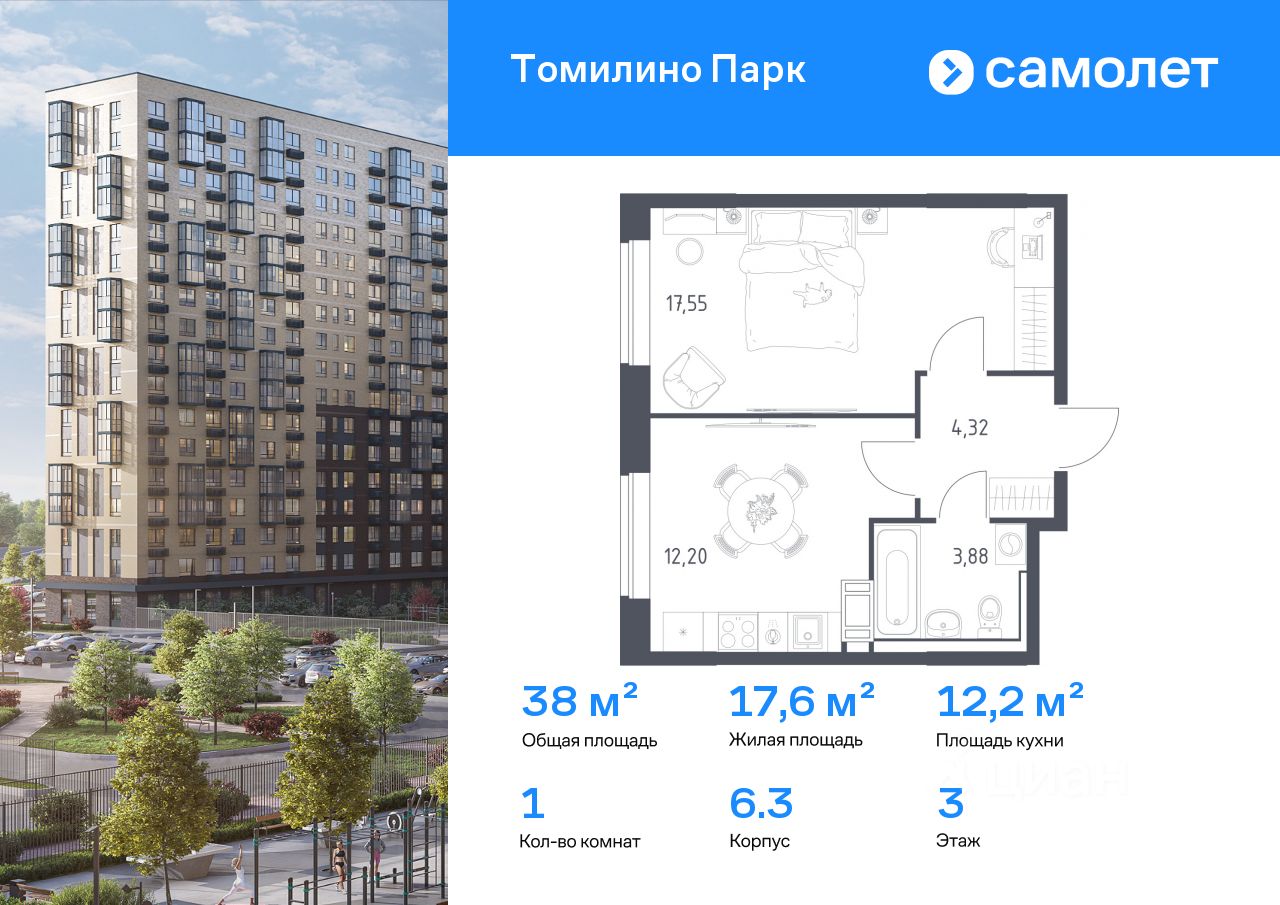 Строим кварталы для жизни с заботой о будущем. Предлагается 1-комнатная квартира комфорт-класса 37,95 кв.м в корпусе 6.3 на 3 этаже, в ЖК "Томилино Парк"