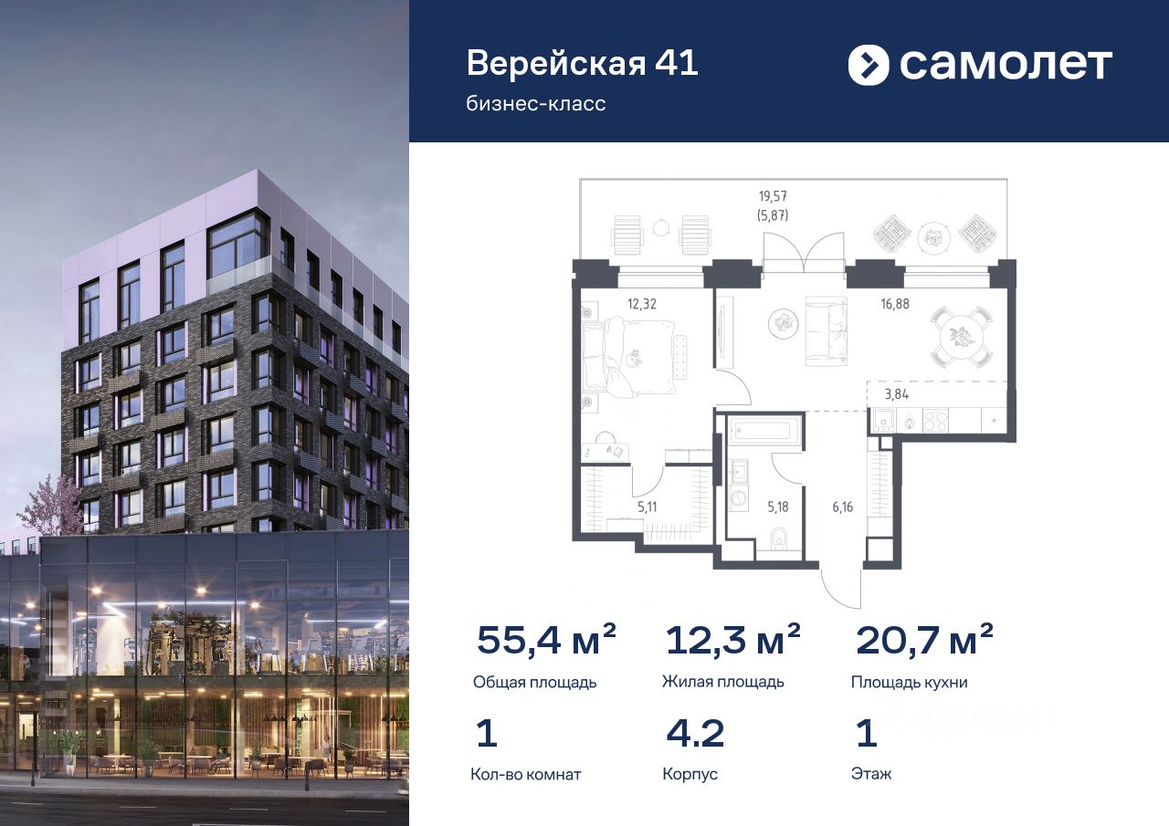 Строим кварталы для жизни с заботой о будущем. Предлагается 1-комнатная квартира бизнес-класса 55,36 кв.м в корпусе 4.2 на 1 этаже, в "Верейская 41"