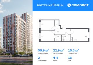 Строим кварталы для жизни с заботой о будущем. Предлагается 2-комнатная квартира комфорт-класса 56,9 кв.м в корпусе 4-5 на 16 этаже, в ЖК "Цветочные Поляны"