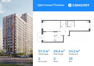 Строим кварталы для жизни с заботой о будущем. Предлагается 2-комнатная квартира комфорт-класса 57,3 кв.м в корпусе 2 на 16 этаже, в ЖК "Цветочные Поляны"