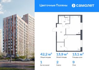 Строим кварталы для жизни с заботой о будущем. Предлагается 1-комнатная квартира комфорт-класса 42,2 кв.м в корпусе 2 на 9 этаже, в ЖК "Цветочные Поляны"