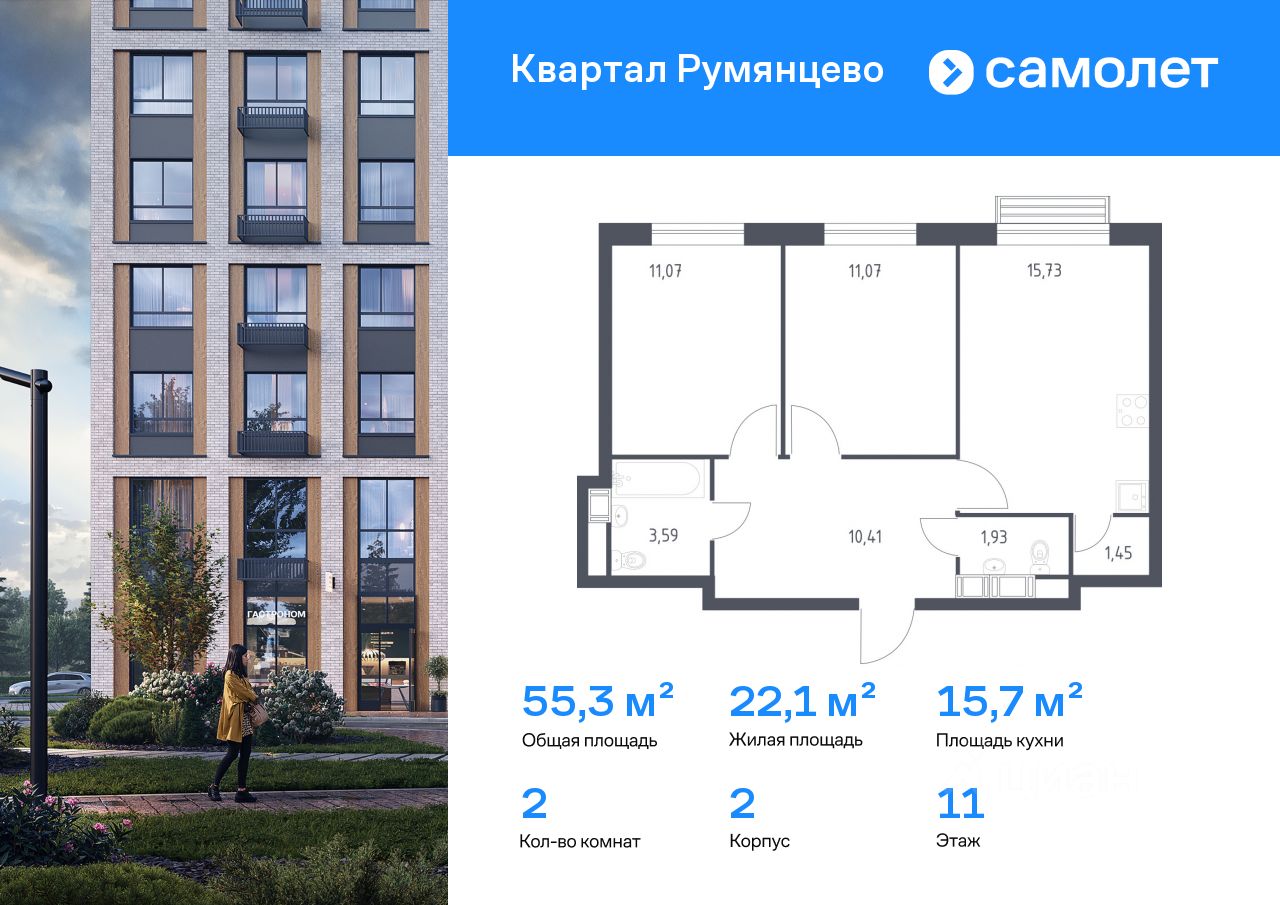 Строим кварталы для жизни с заботой о будущем. Предлагается 2-комнатная квартира комфорт-класса 55,25 кв.м в корпусе 2 на 11 этаже, в ЖК "Квартал Румянцево"