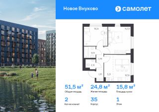 Строим кварталы для жизни с заботой о будущем. Предлагается 2-комнатная квартира комфорт-класса 51,45 кв.м в корпусе 35 на 1 этаже, в ЖК "Новое Внуково"