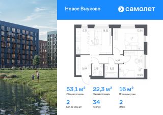 Строим кварталы для жизни с заботой о будущем. Предлагается 2-комнатная квартира комфорт-класса 53,09 кв.м в корпусе 34 на 2 этаже, в ЖК "Новое Внуково"