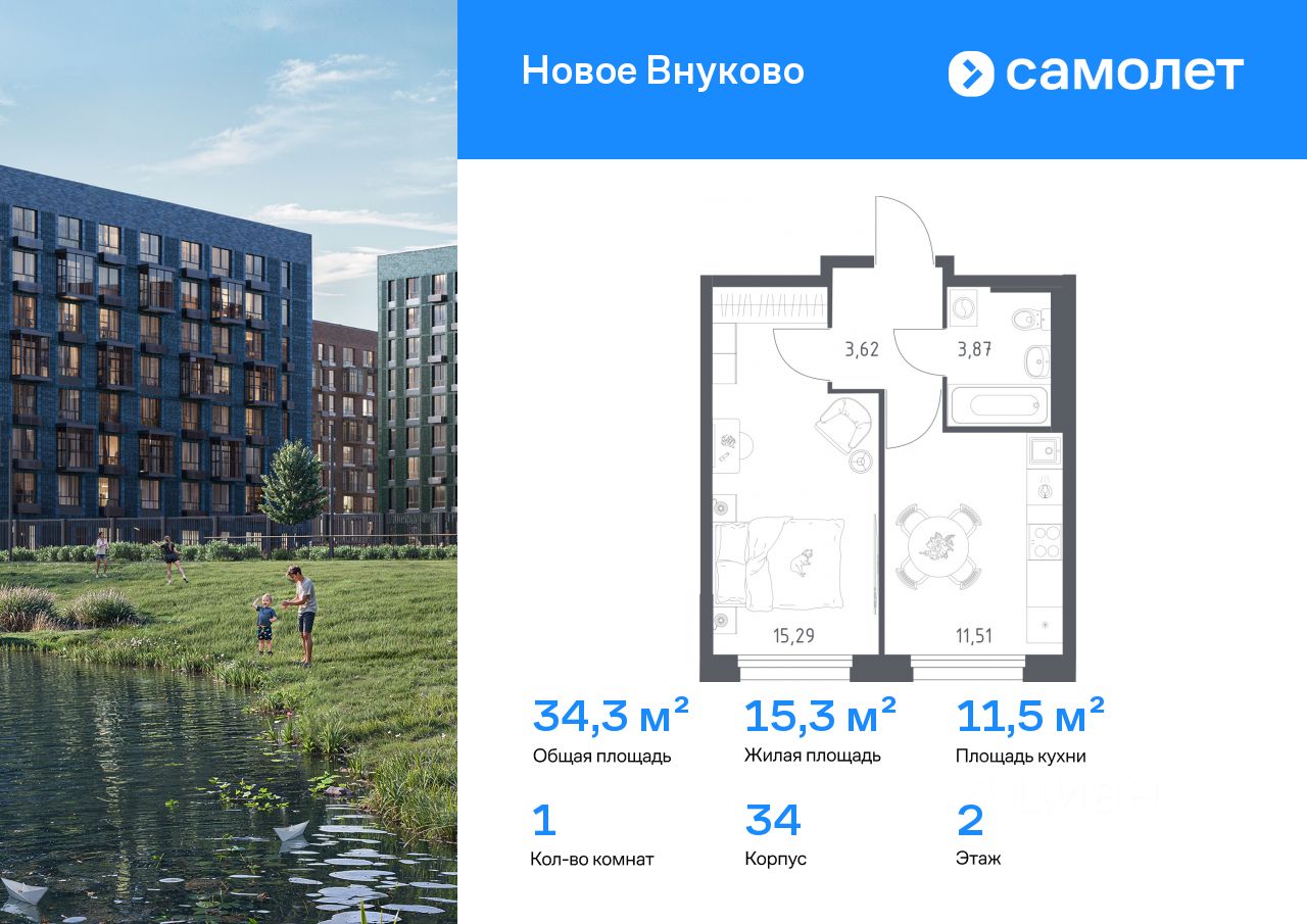 Строим кварталы для жизни с заботой о будущем. Предлагается 1-комнатная квартира комфорт-класса 34,29 кв.м в корпусе 34 на 2 этаже, в ЖК "Новое Внуково"