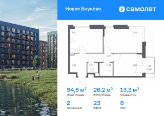 Строим кварталы для жизни с заботой о будущем. Предлагается 2-комнатная квартира комфорт-класса 54,53 кв.м в корпусе 23 на 8 этаже, в ЖК "Новое Внуково"