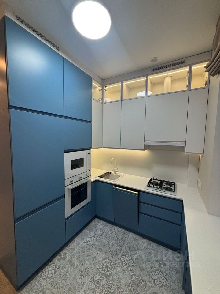 На кухне установлены: Холодильник, СВЧ, посудомоечная машина, духовой шкаф, варочная панель, измельчитель отходов, вытяжка. Столешница переходит в подоконник, увеличивая при этом рабочую поверхность. Рабочая поверхность имеет светодиодную подсветку. Площадь кухни использована с максимальной эффективностью.
