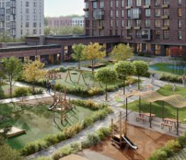 В закрытых дворах-парках предусмотрены игровые площадки, лужайки для пикников и йоги. Пространства для спокойного отдыха будут огорожены живыми изгородями.