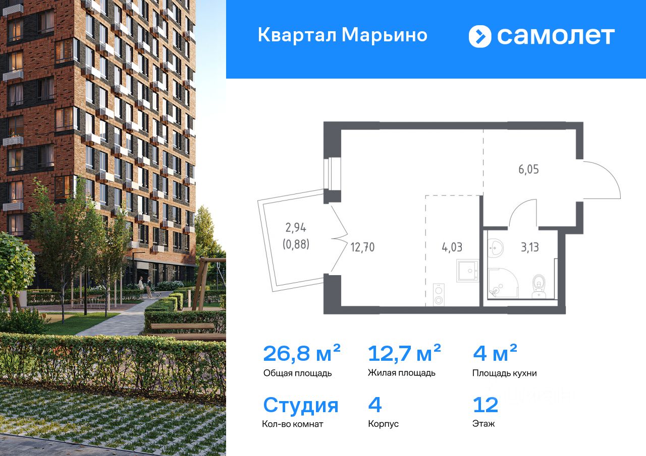 Строим кварталы для жизни с заботой о будущем. Предлагается квартира студия комфорт-класса 26,79 кв.м в корпусе 4 на 12 этаже, в ЖК "Квартал Марьино"