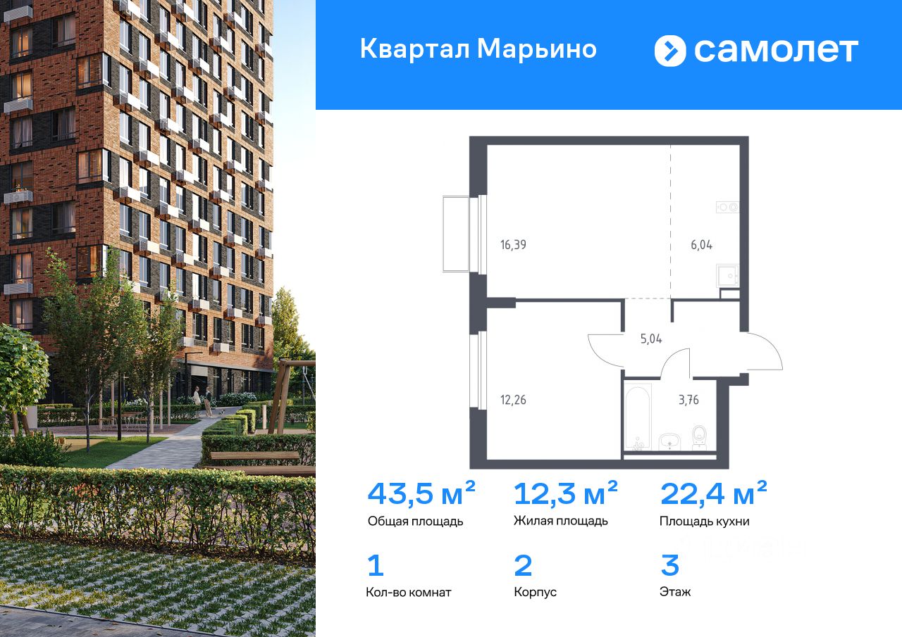 Строим кварталы для жизни с заботой о будущем. Предлагается 1-комнатная квартира комфорт-класса 43,49 кв.м в корпусе 2 на 3 этаже, в ЖК "Квартал Марьино"