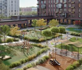 В закрытых дворах-парках предусмотрены игровые площадки, лужайки для пикников и йоги. Пространства для спокойного отдыха будут огорожены живыми изгородями.