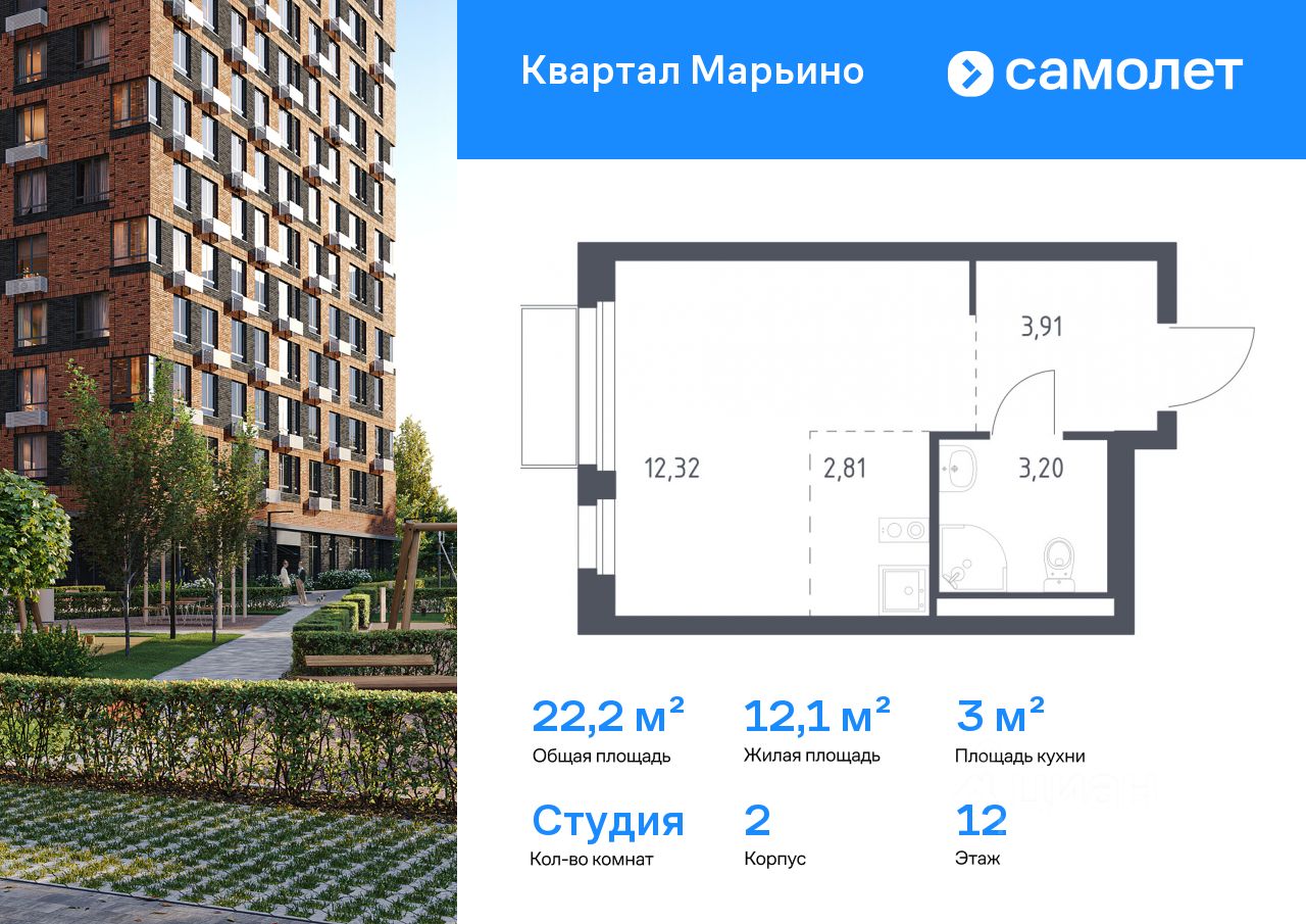 Строим кварталы для жизни с заботой о будущем. Предлагается квартира студия комфорт-класса 22,24 кв.м в корпусе 2 на 12 этаже, в ЖК "Квартал Марьино"