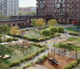 В закрытых дворах-парках предусмотрены игровые площадки, лужайки для пикников и йоги. Пространства для спокойного отдыха будут огорожены живыми изгородями.