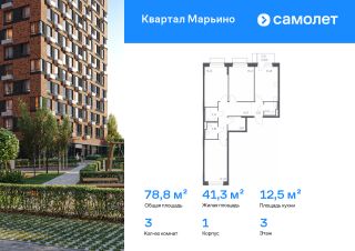 Строим кварталы для жизни с заботой о будущем. Предлагается 3-комнатная квартира комфорт-класса 78,8 кв.м в корпусе 1 на 3 этаже, в ЖК "Квартал Марьино"