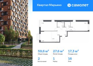 Строим кварталы для жизни с заботой о будущем. Предлагается 2-комнатная квартира комфорт-класса 59,6 кв.м в корпусе 1 на 16 этаже, в ЖК "Квартал Марьино"