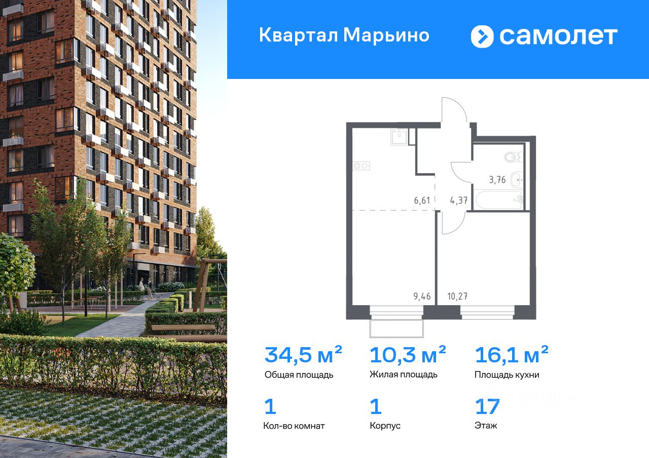 Строим кварталы для жизни с заботой о будущем. Предлагается 1-комнатная квартира комфорт-класса 34,47 кв.м в корпусе 1 на 17 этаже, в ЖК "Квартал Марьино"